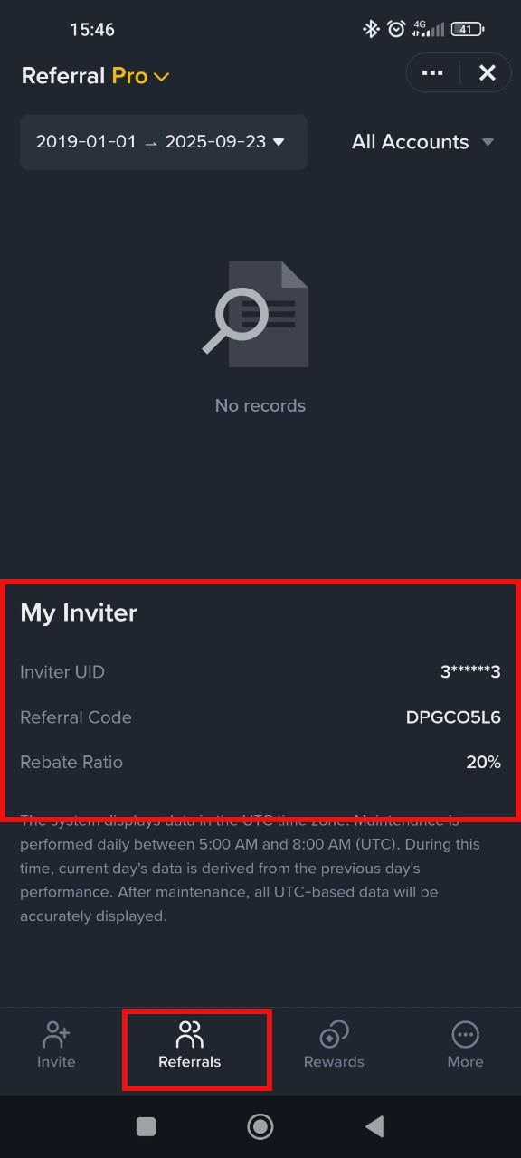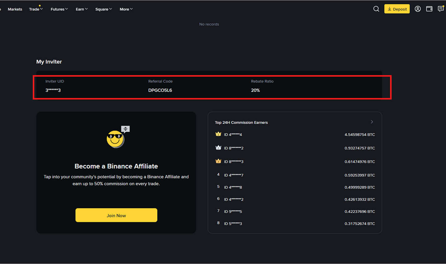 Scroll down, and in the section "My Inviter” you will see the first and last digit of the UID of the person who invited you (affiliate/referrer).