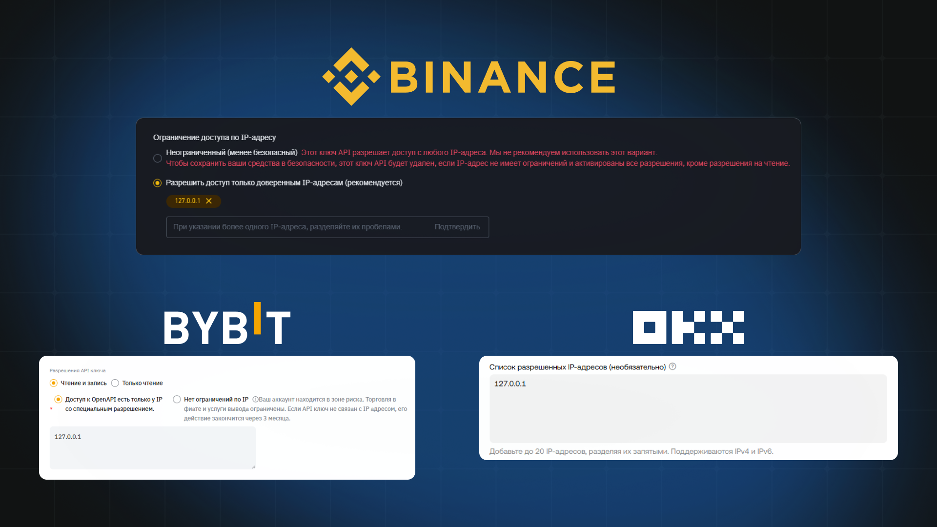 Пройдите верификацию личности на бирже, без неё торговые ключи не работают. Затем сгенерируйте API‑ключи с правами Read, Trade, Futures